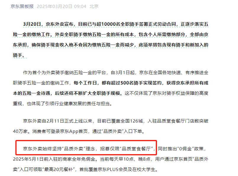 2024年初,京東高調宣佈進軍外賣市場,還記得創始人劉強東在內部信中豪言:“京東不做低端外賣,我們要做就做‘品質外賣’,所有商家必須證照齊全,確保食品安全!”