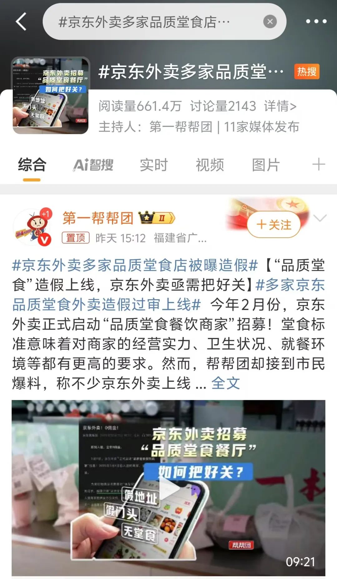 5月8日,福建電視台《第一幫幫團》欄目曝光了福州地區多家入駐京東外賣的“品質堂食”門店資料造假的情況。