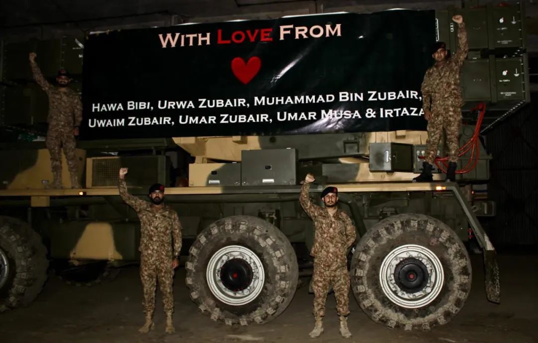 巴基斯坦在火箭炮上掛着橫幅,寫着“WITH LOVE FROM”(給你們的愛),下面印上被印度炸死的孩子們的名字