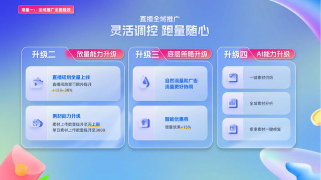 另外,放量能力、策略增效、AI能力等多方面的升級,進一步提升了大促跑量的效果。直播規劃功能可為商家額外帶來15%-30%的大場跑量爆發效果,素材上傳數量的提升也解決了商家大促期間素材量大的需求。在策略增效層面,直播全域推廣可為商家帶來自然流量和廣告流量的更好協同,幫助商家提升超過10%的跑量效果。此外,AI能力的升級,大幅提升投放效率,助力商家投放更省心。