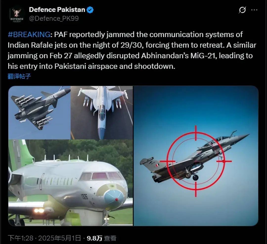 回到現實,在大規模空戰爆發前的5月1日,《巴基斯坦防務》就曾在X上面發文稱:4月29日夜間印巴空軍爆發這場對峙時,巴基斯坦軍隊在相關空域實施了大規模的電磁干擾,這種電磁干擾成功壓制了陣風戰鬥機的通信系統,最終讓陣風戰鬥機不得不撤離。
