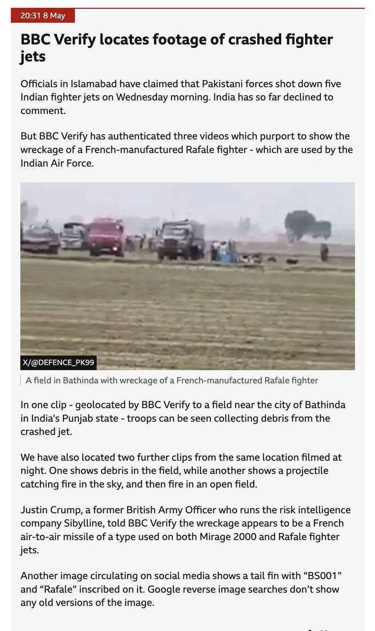 5月7日,在印巴衝突擴大後,雙方展開了大規模空戰,印度來勢洶洶預備襲擊克什米爾巴控區的戰術目標,但被巴基斯坦空軍和防空部隊打了個5:0,還有傳回的現場視頻。