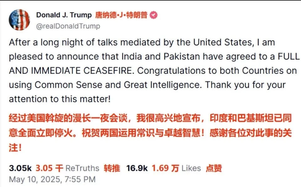 要知道,此前美國還明確表態稱此事與自己無關,僅僅表達了希望印巴儘早停火的意願,如今特朗普此舉實在蹊蹺,為何要突然跑出來攬下這份功勞?
