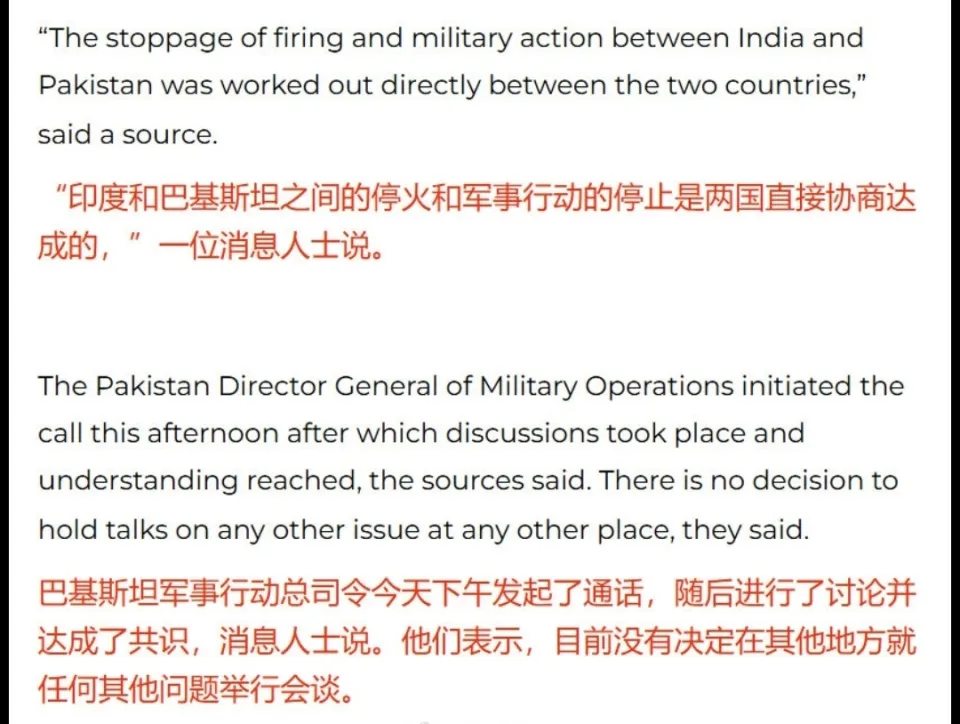 至於此次停火,實際上有三十多個國家從中斡旋。巴方表示,中國、俄羅斯、美國、沙特等眾多國家都向巴方表達了避免局勢升級的期望。當然,也有許多國家與印度進行了溝通,傳達了類似的意願。