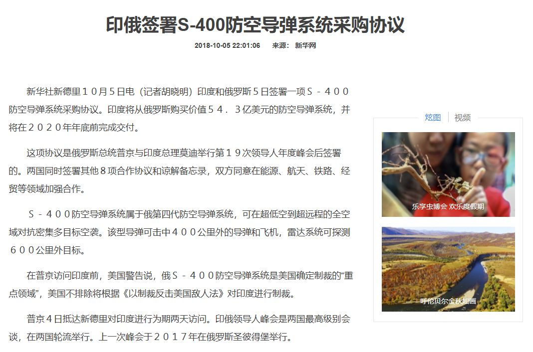 2018年,印度與俄羅斯簽署了一項協議,以54.3億美元的價格購買5套S-400系統。每套系統將有一個移動指揮中心、不同類型的雷達和8部導彈發射車,目前已經有3個團的S-400已經交付,還有2個團預計於今年交付。