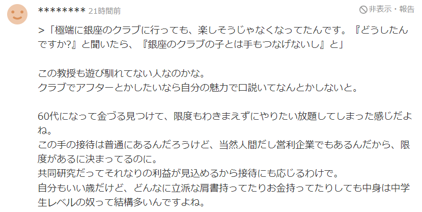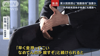 就這樣平均每次消費60-70萬日元,至於買單……那當然是引地功一的事情了。該員工非常負責任的告訴記者,教授們一分錢都沒出過,他們覺得別人請客是天經地義的事情,能請他們去銀座喝酒完全就是對方的榮幸啊。