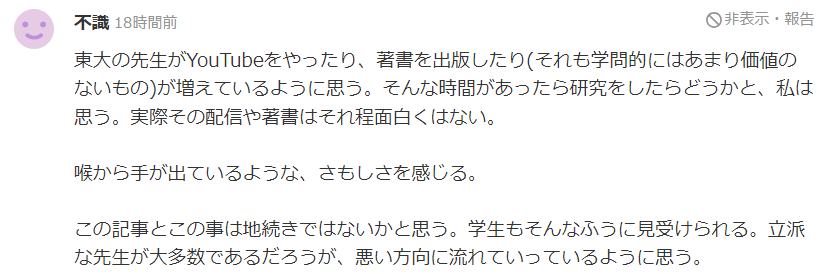 感覺現在越來越多的東大教授都在Youtube做視頻、出些在學術上沒什麼價值的書。我有時候會想,有這個時間,為什麼不去好好做研究?講實話,這些視頻和書籍並沒有很有趣。
