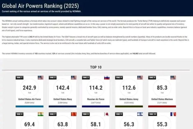 一直以為什麼“空軍排行榜”只是以前國內軍迷圈子編的段子,沒想到他們真是這麼認為的,什麼“美國空軍、美國海航、美國陸航、美國國民警衞隊”排世界前五的説法,原來源自於他們自己……他們已經狂妄自大到真以為自己的空中力量碾壓全世界,可以打三體人了。