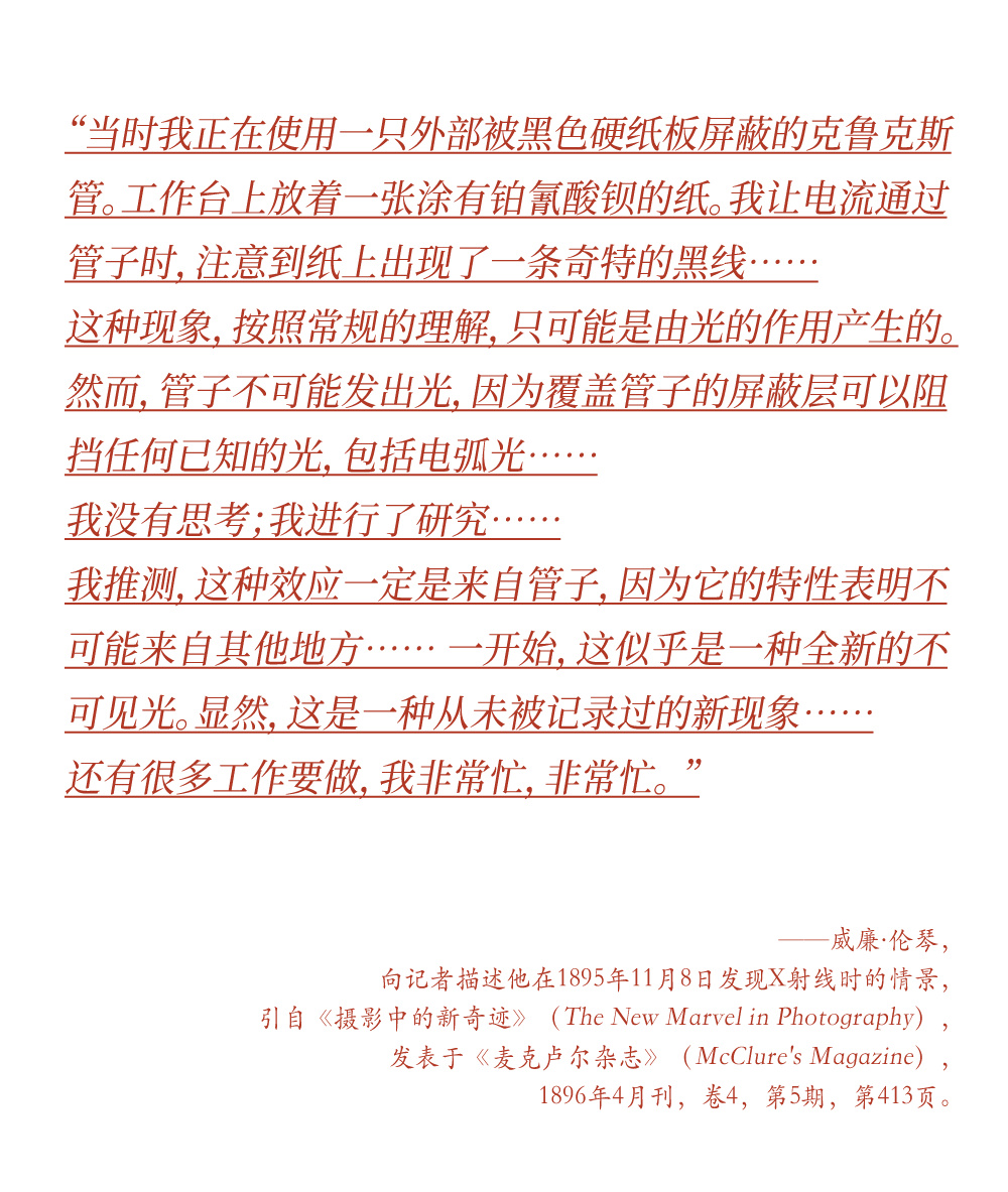 接下來讓我們來到1895年11月8日(星期五),那個意義非凡的日子。當時,倫琴正在進行實驗,旨在驗證倫納德之前的研究成果。他使用了一隻低功率的倫納德管,用硬紙板和錫箔紙包裹以防止任何可見光外泄,並在靠近管子時用陰極射線照射一塊塗有鉑氰酸鋇(barium platinocyanide)的硬紙板屏幕,觀察到其產生的熒光。他敏鋭的分析思維驅使他以另一種方式重複實驗,他想知道是否可以在更高強度的全玻璃希托夫-克魯克斯管上觀察到類似的效果。他選用了一隻更大的管子,用硬紙板包裹,連接到他的倫科夫線圈,然後使房間完全變暗,並激活線圈以通過管子傳導電流。他首先確認沒有可見光泄漏,並觀察到管子附近屏幕上的熒光。