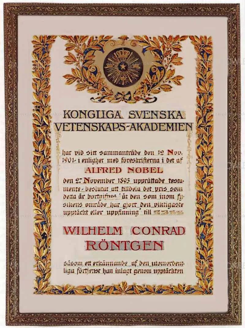 倫琴獲得首個諾貝爾物理學獎的證書