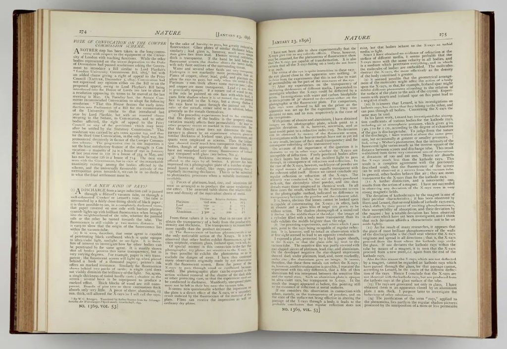 這種新現象的離奇程度讓威廉一度開始懷疑自己的判斷力。儘管這一發現令人驚歎,他仍對是否將其公之於眾感到猶豫。甚至他的實驗室助手都不知道這些射線的存在。他一遍遍測試自己的發現,日夜在實驗室觀察以尋找新的變化,但他進行的每一個實驗都證明了他的設備和發現是無懈可擊的。最終,他確信無誤,並於1895年12月28日將他的重要論文《一種新型射線的研究》(On A New Kind Of Rays)提交給維爾茨堡物理醫學學會(Wurzburg Physical Medical Society)。論文概述了新射線的十七項基本特性。學會立即將其付印,但直到次年1月底的會議上才進行公開宣讀。