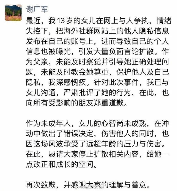 今年3月,“月入22萬”的百度副總裁謝廣軍因女兒“開盒”孕婦事件致歉,一度登上熱搜榜首。其女兒涉嫌曝光他人隱私信息,引發軒然大波。