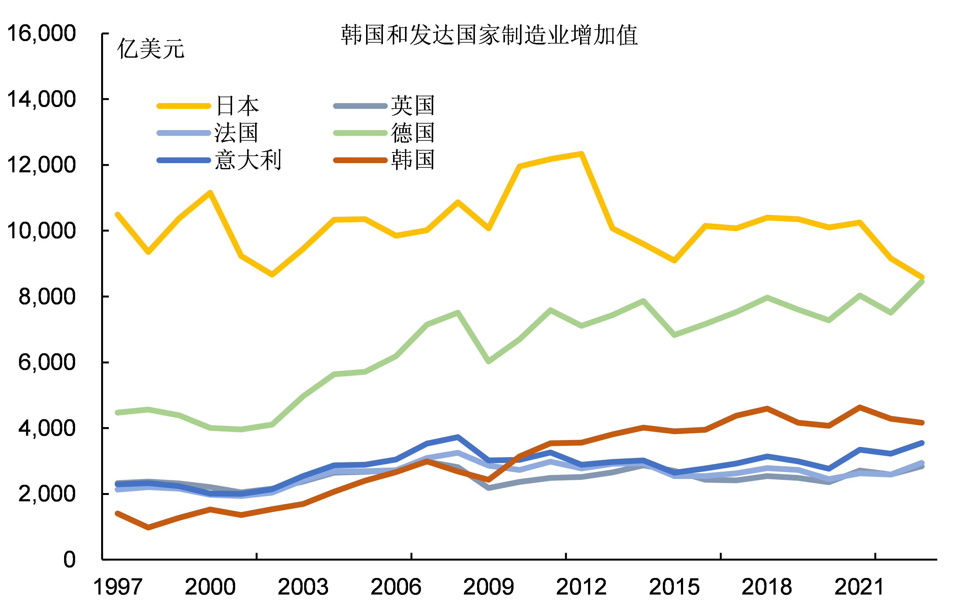 即使以製造業增加值的絕對數值來看,韓國與七國集團相比也僅次於美國和德國,超過其它5個國家。