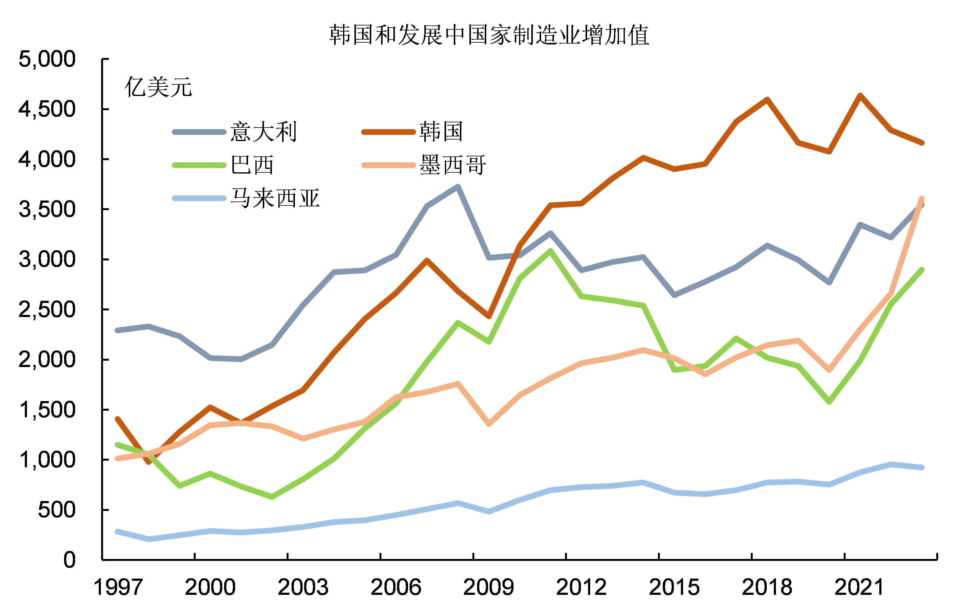 在1997年,韓國和巴西、墨西哥的製造業規模基本還處在同一水平,都只有1000多億美元的規模。