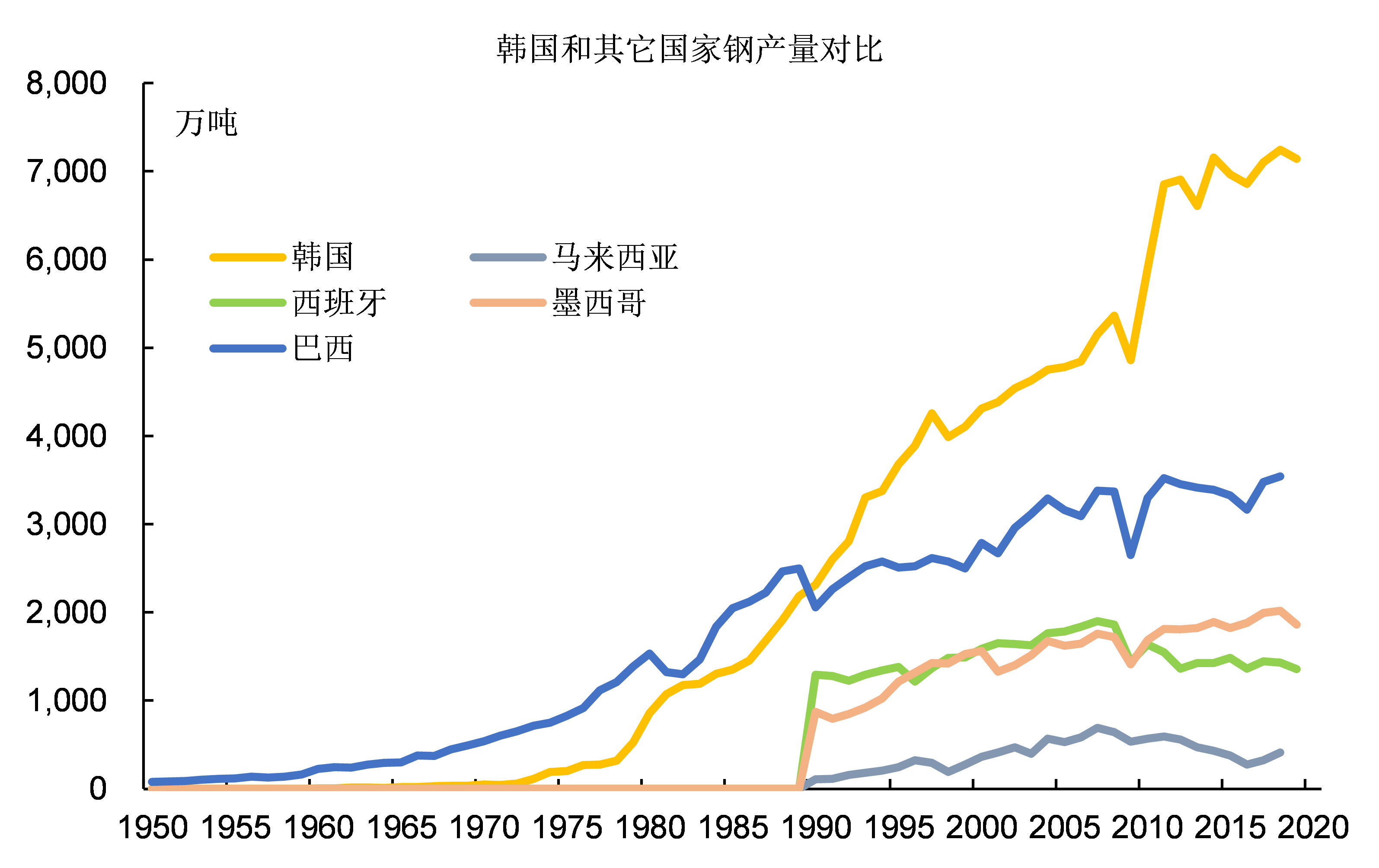 巴西鋼鐵工業的發展遠遠早於韓國,而且巴西擁有全世界數一數二的鐵礦石資源,但是1990年韓國的粗鋼產量就超過了巴西。