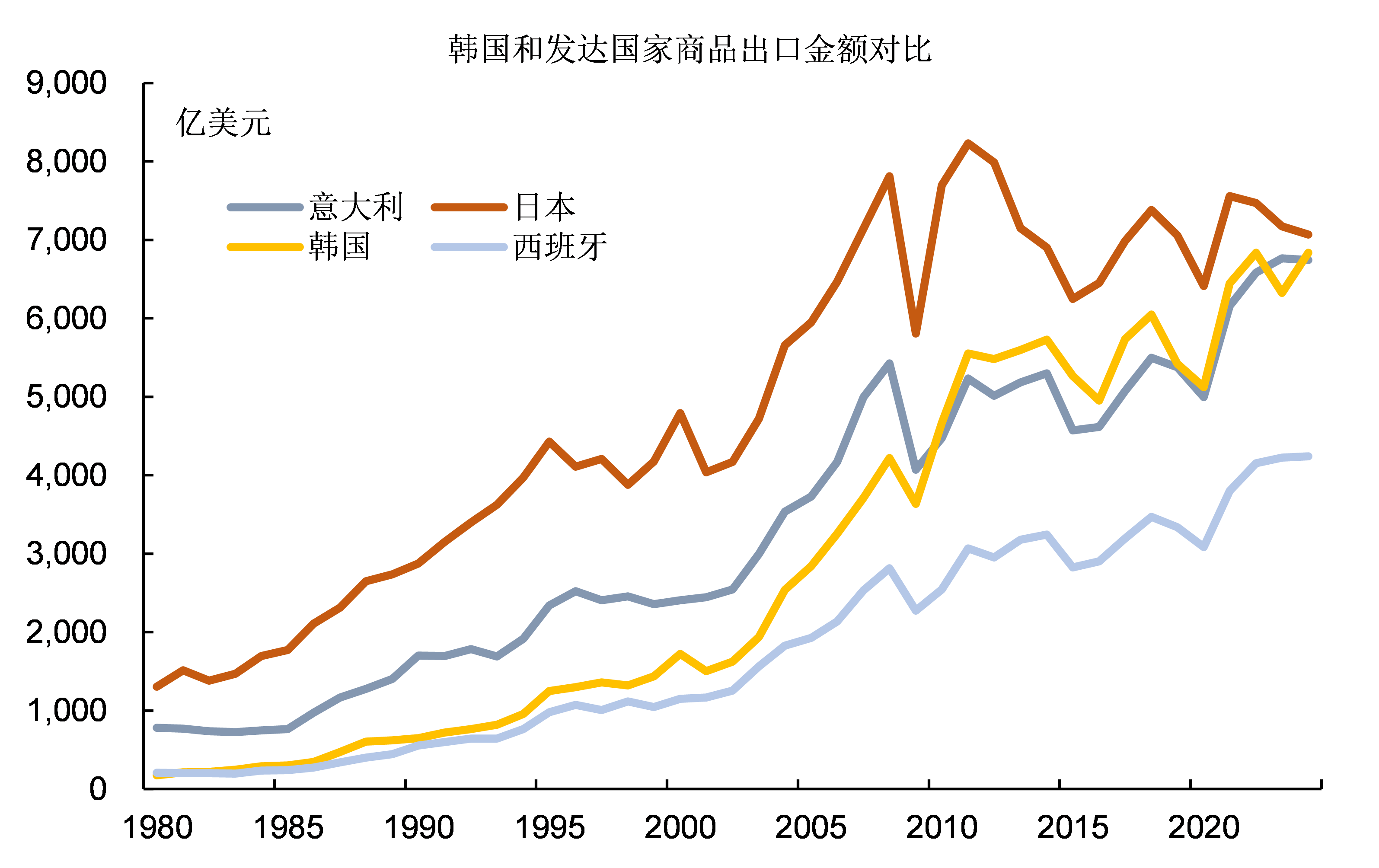 韓國的商品出口金額在八十年代末期就已經超過了發達國家守門員西班牙,到2010年更是超過了意大利。