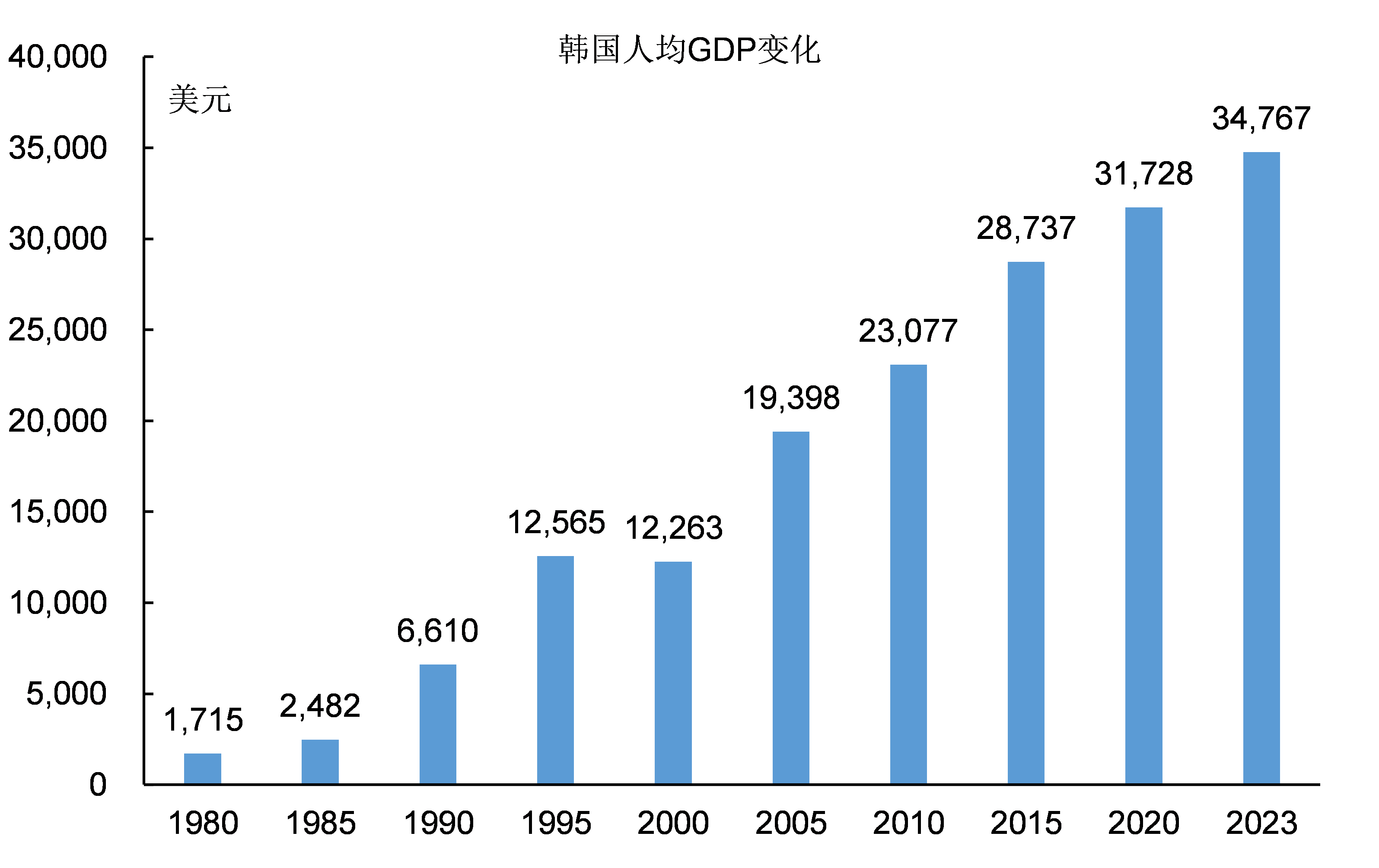 經過20年的高速增長,雖然在此期間經歷了亞洲金融風暴的衝擊,到2000年韓國的人均GDP仍然增長到12263美元。