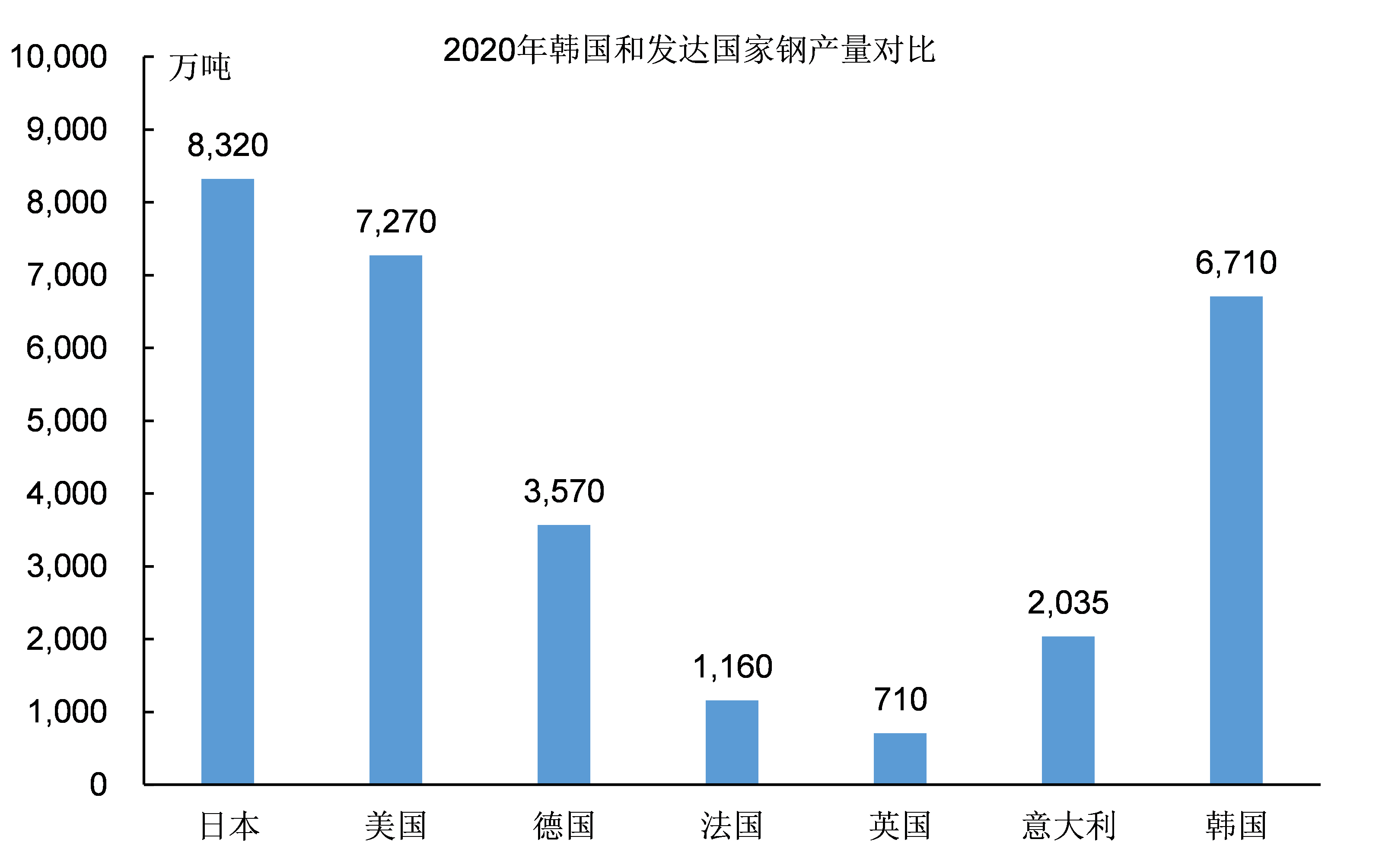 韓國的粗鋼產量已經大幅領先歐洲的德國、法國和英國:德國2020年的粗鋼產量只有3570萬噸,法國只有1000多萬噸,英國更是連1000萬噸都不到。