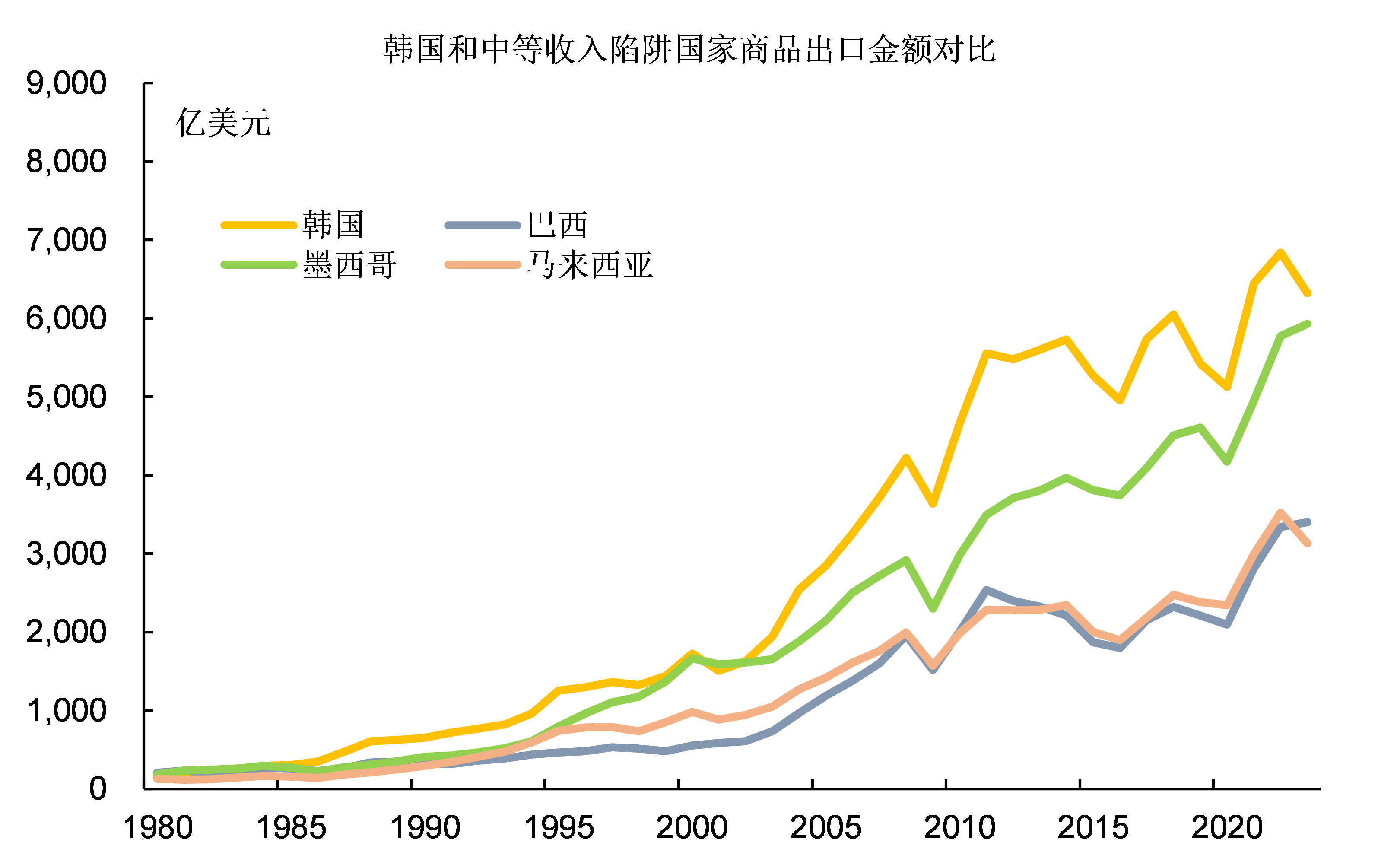 在八十年代,韓國的商品出口金額和巴西、墨西哥等國家相差不多;到2023年韓國的商品出口金額超過墨西哥,更是巴西的兩倍。