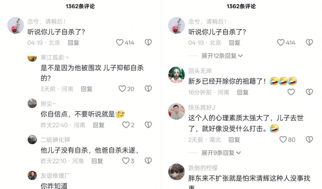 在宋清輝質疑胖東來沒有競爭力的視頻下面,不少人留言問候“聽説你兒子自殺了?”