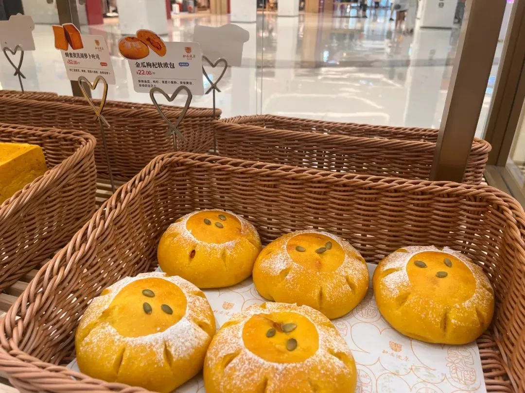李新在社交媒體上被種草後,來五棵松萬達店買過幾次中式麪包。就她嘗過的金瓜枸杞軟歐包、枸杞原漿牛角包來看,吃起來沒有明顯的中藥味,反而是一種不太膩的甜味。