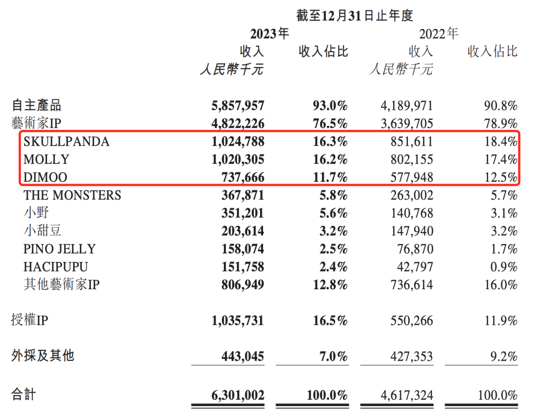 然而,相比於泡泡瑪特三大擬人IP Molly、SkullPanda和Dimoo,The Monsters早期表現其實並不起眼,在很長一段時間裏,泡泡瑪特前三頂流在營收表現上都是斷層式領先。