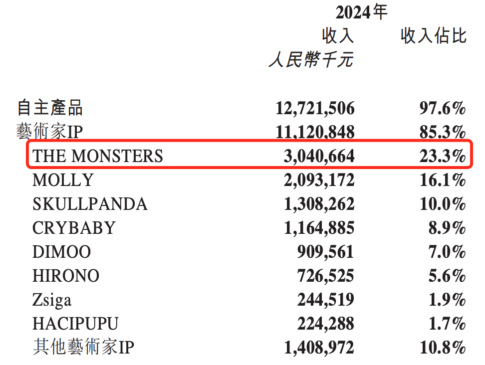 狂熱之下,以LABUBU為首的The Monsters系列產品去年銷售額高達30.4億元,貢獻了泡泡瑪特整體營收23.3%,成為2024年泡泡瑪特旗下當之無愧的第一IP。