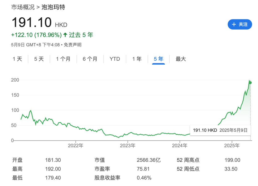 與LABUBU一同起飛的還有泡泡瑪特的股價,過去一年多泡泡瑪特股價從接近低位的20港元/股,一路飛漲至如今超過190港元/股,市值突破2500億港元,比全球玩具巨頭孩之寶和美泰兩家公司加起來的總市值還要高上一截。