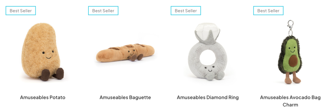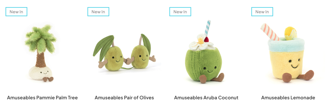 Jellycat深受成年人喜歡一個重要原因,**源自於它那些不按套路出牌的娃娃設計,**簡單來説就是萬物皆可Jellycat,從動物、植物、海洋生物,到食品、飲料、日用品,只要長着豆豆眼的微笑臉往上一貼,瞬間就有了品牌辨識度,根本沒有創作瓶頸。