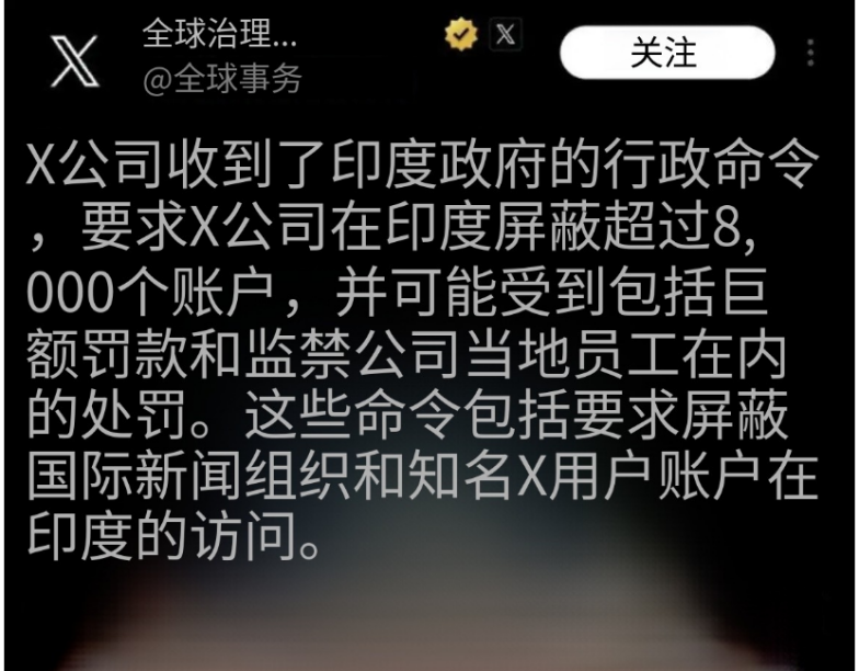 對此社交媒體公司X對外宣稱,其已收到印度政府的行政命令,要求在印度境內封禁超過8000個賬户,被列入封禁名單的涵蓋了國際新聞機構的賬號。