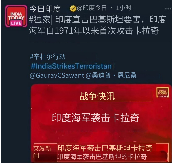 首先我們看下印度宣稱的各種戰績,印度官方宣佈印度海軍自1971年以來首次攻擊巴基斯坦核心城市卡拉奇。