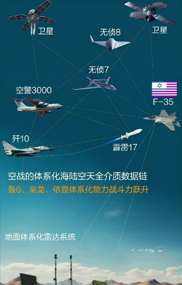 用一幅圖作為説明,現代的空中戰爭已經不光光是靠飛機的數量,首先是飛機自身擁有源相控陣雷達、雙向數據鏈等先進的技術裝備,同時依靠導彈的射程,地面雷達,預警機和無人機通過信息傳導和定位和一體化系統作戰。