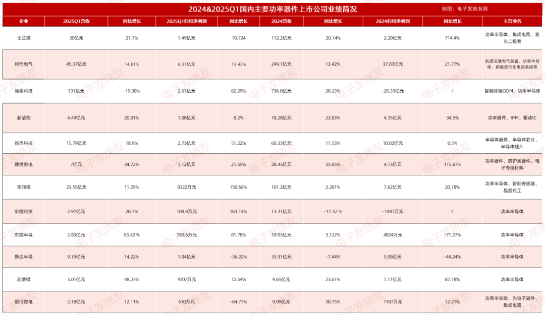 本文統計了12家A股上市的功率半導體廠商,包括士蘭微、時代電氣、聞泰科技、新潔能、揚傑科技、捷捷微電、華潤微、宏微科技、東微半導、斯達半導、芯朋微、銀河微電等功率半導體廠商,在2024年和2025年一季度的業績情況,從財報看當下功率半導體市場情況到底如何。