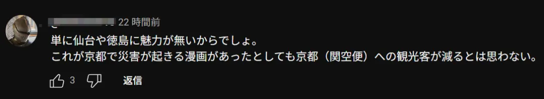 “只是因為仙台和德島這兩地沒啥吸引人的地方吧。如果有漫畫描繪京都發生災害,我也不認為會導致前往京都(關西機場航班)的遊客減少。”