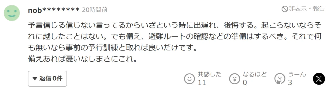 “在那邊糾結‘信不信預言’的時候,一旦真的發生了,就會因為行動遲緩而後悔。如果沒發生那自然是最好的結果。但是事先的準備、確認避難路線等,這些該做的事情還是應該做的。如果最終什麼都沒發生,那也可以當作是一次預演。所謂有備無患,正是這個道理。”