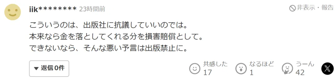 “這種事情,是不是應該向出版社抗議才對?原本應該帶來收入的部分,也應該作為損害賠償來處理。如果做不到這一點,那就應該禁止發表這種惡意的預言。”