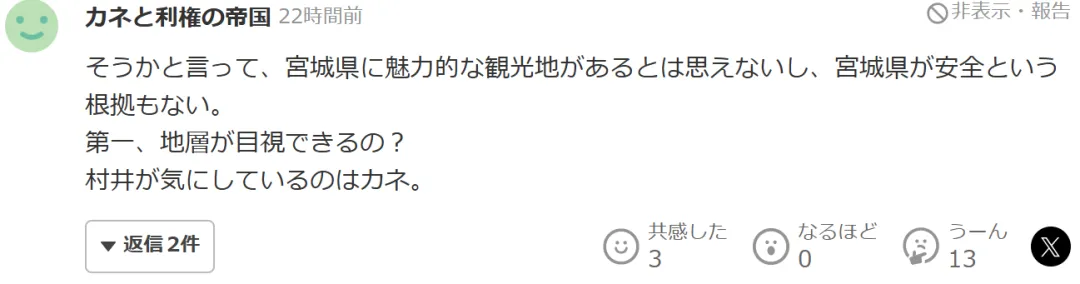 “話雖如此,我並不覺得宮城縣是有什麼吸引力的旅遊地,也沒有任何證據表明宮城縣就是安全的。首先,地層能用肉眼就看出來安不安全嗎?村井知事在意的只是錢罷了。”