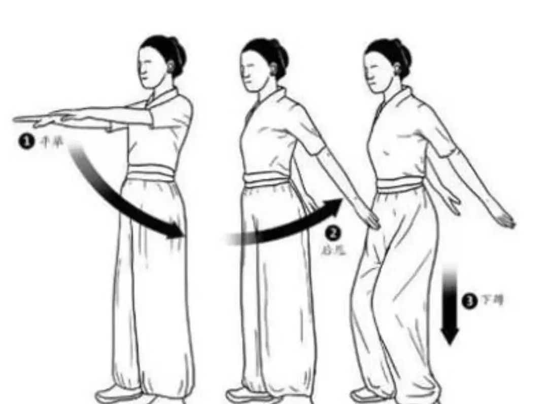 先是站立甩動兩次,然後微屈膝甩動一次,甩手的時候要用七分力,回手的時候用三分力。