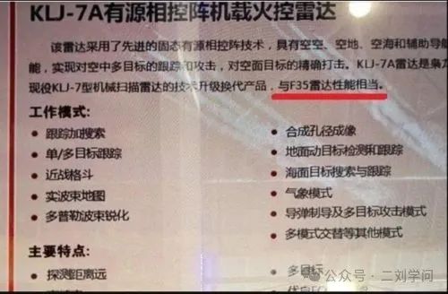 中國的雷達有多厲害?下圖是航展上展出的一款外貿版機載火控雷達,是梟龍戰機雷達的升級版,在產品介紹中已經明確與美國F35雷達性能相當。梟龍戰機是中國為巴基斯坦量身打造的三代戰鬥機(升級後具有部分四代機能力),是替代巴空軍老舊的F16ABCD戰機的,主要對手是印度空軍的幻影2000和米格29這類飛機,而殲10C戰機可是中國自己的現役戰機,其雷達水平當然要強於梟龍。