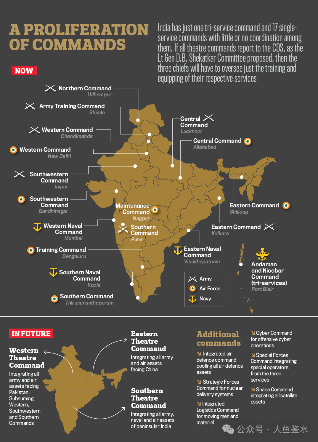 這就導致印度陸海空三軍在各個區域內的兵力仍然是各自為戰的狀態,合成水平低下,缺乏統一指揮,軍種協調困難。2020年建議成立的聯合防空司令部在2023年被證實不會投入運作,因為空軍表示“將有限的空戰力量劃分給不同的司令部是不明智的”,實質上還是不肯放棄手中的兵力和預算。