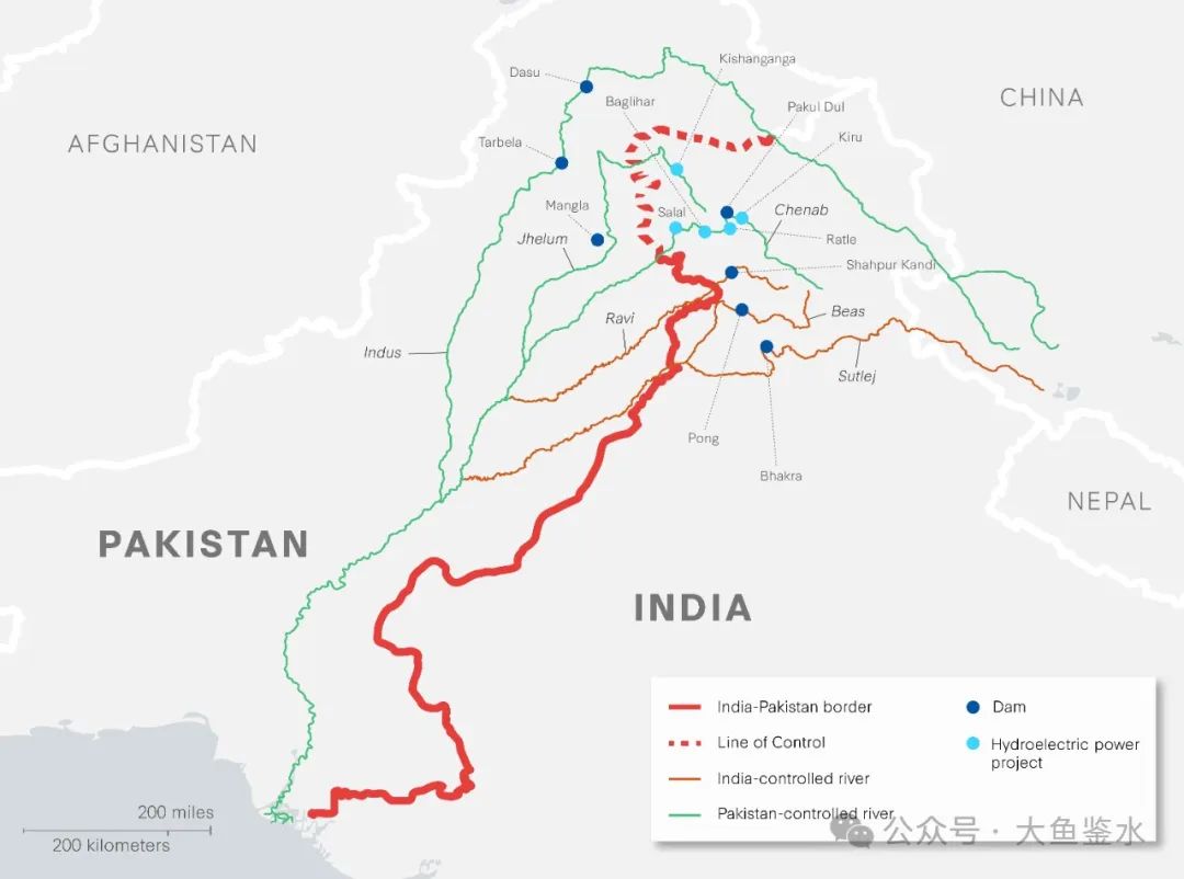 > 《印度河水協議》分配方案,綠色為巴控河流,最上面一條為印度河干流;褐色為印控河流,深藍色點為大壩,淺藍色點為水電項目,紅色為印巴邊界,紅色虛線是克什米爾印巴實控線