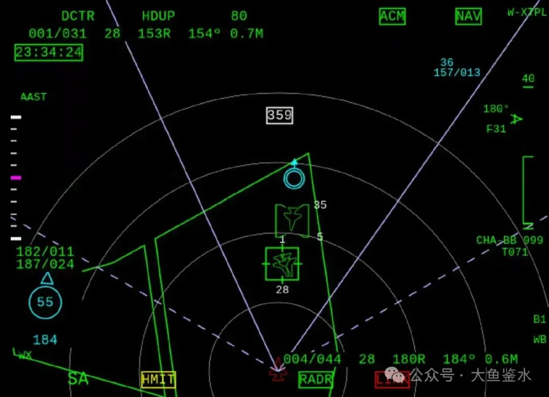 > F-16多功能顯示器顯示的戰場態勢圖像,它還能顯示武器交戰範圍,幫助飛行員判斷威脅程度