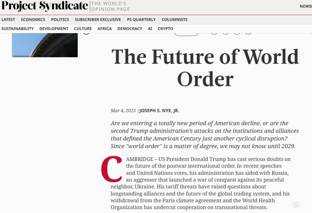 時間來到2025年,冷戰和熱戰同時正在發生,對立撕裂重新成為全球主流情緒。約瑟夫·奈在Project Syndicate最後的這幾篇絕筆式專欄裏系統性地討論了地緣政治與全球化的未來。其中在《世界秩序的未來》一文中,他寫道: