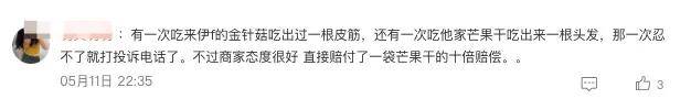 該事件被曝光後**,網友們紛紛曬出自己的經歷**,比如有人表示:「有一次吃來伊f的金針菇吃出過一根皮筋,還有一次吃他家芒果乾吃出來一根頭髮,那一次忍不了就打投訴電話了。不過商家態度很好 直接賠付了一袋芒果乾的十倍賠償。」