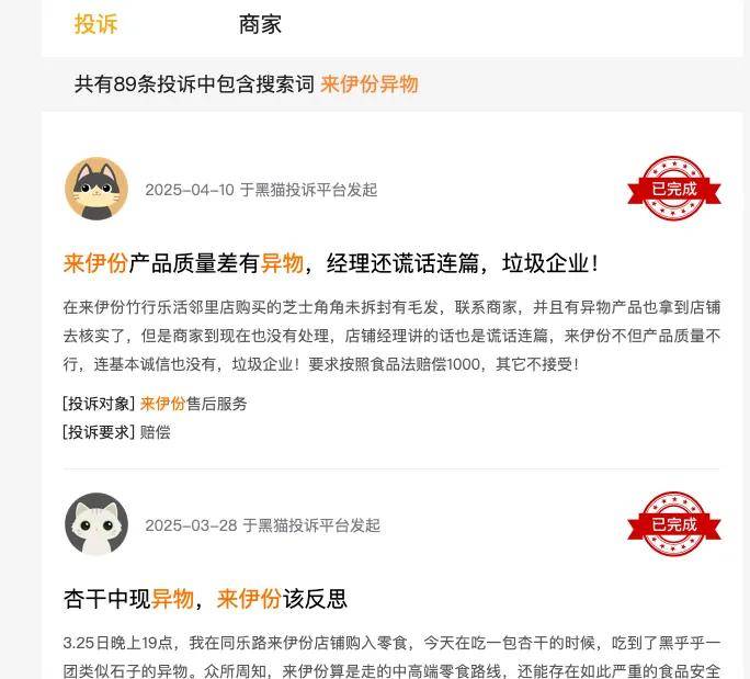 而小柴檢索發現,在黑貓投訴上檢索「來伊份異物」關鍵詞,投訴量高達八十多條。