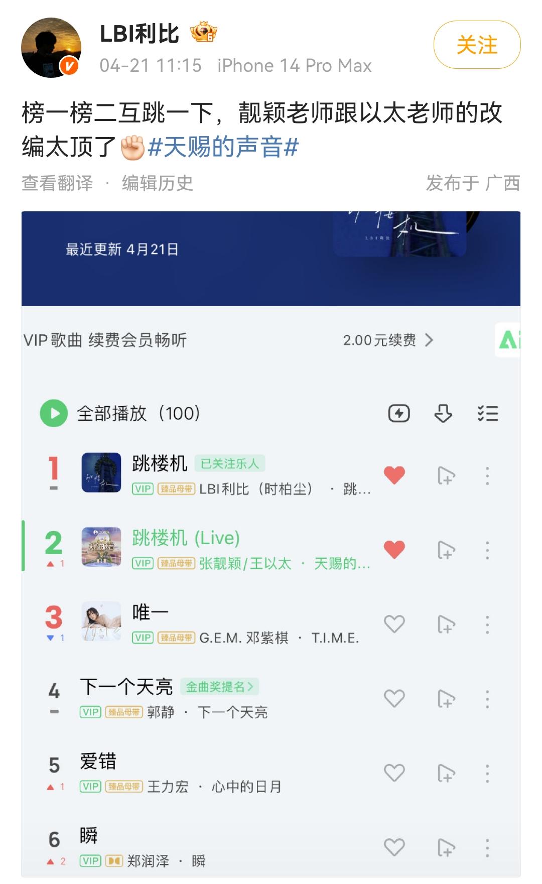 正是因此,不少作為生產者的音樂人,難免要放棄一定的雅俗不共賞原則,畢竟吃飽才是最重要的。像是在《天賜的聲音第七季》中,王源、劉宇寧、王赫野等均表示想選《跳樓機》,但由於演唱難度,最終落在了演唱機能Next Level的張靚穎與搭檔王以太身上,並呈現出了頗受歡迎的“去賤版”《跳樓機》。