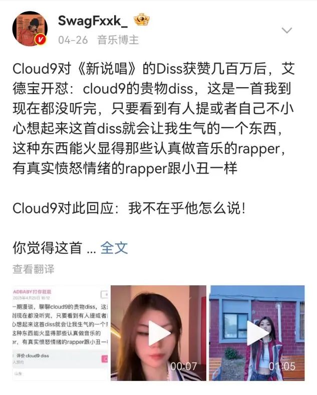 同樣的,憑藉一首跟愛奇藝《中國新説唱2025》貼臉開大的Diss,説唱新人 Cloud9確實從“查無此人”的狀態被圈內知曉,被戲稱“碾壓VaVa”、“下一個VaVa”;甚至還藉此獲得胡彥斌認證,直播晉級騰訊視頻的新音綜《讓我來唱》。