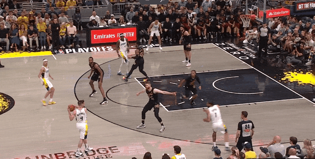 步行者積極活用特納和託平:特納高位策應喂託平內切、麥康內突破喂特納上線三分、哈利伯頓和特納高位二人轉喂弱側託平遠射:騎士被打懵了。