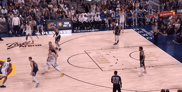 ——掘金下半場第一球,戈登上線拿球,約基奇給波特掩護,哈騰擋約基奇,傑威擠掩護追,波特內切扣籃。