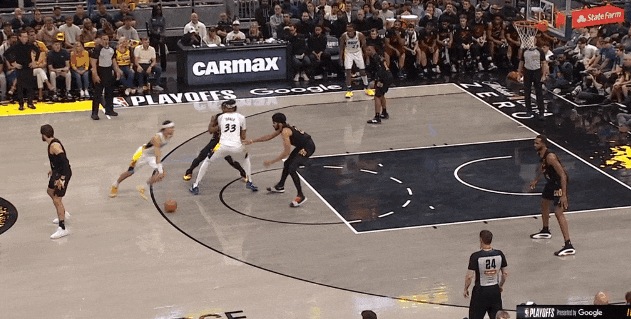 上一場騎士3-2聯防的核心,是莫布里在上線切割了哈利伯頓的策動——上一場哈利伯頓4分——於是今天騎士守盯人時,步行者頻頻把加雷特·阿倫扯到上線: